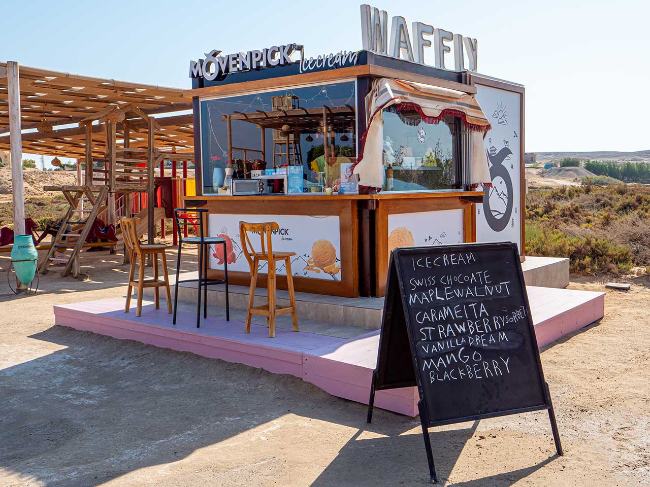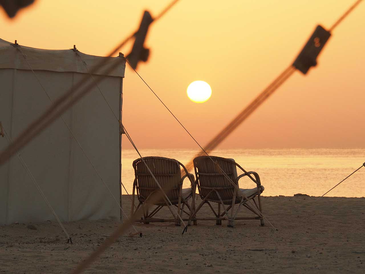 À côté, 35 Tentes Royales de 25 m2 sont équipées d’un grand lit double ou de deux lits simples, un ventilateur, mini-réfrigérateur, un coin salon avec des poufs et une petite table. L’espace commun des sanitaires n'est pas loin, la mer non plus.