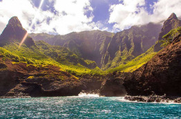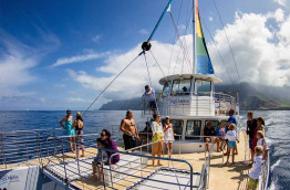 Petit-déjeuner libre. Aujourd’hui, on vous propose de faire une croisière le long de la côte de Na’Pali au départ de Port Allen au Sud de Kauai. C’est la seule façon de pouvoir admirer cette côte car, totalement sauvage, on ne peut pas y accéder par la route. Les grands marcheurs peuvent entreprendre une randonnée, mais elle n’est pas accessible à tous. Quant au survol en hélicoptère, il donne une autre vision dans tous les cas, la croisière permet d’apprécier la force de la nature. On se sent vraiment tout petit. Ces falaises abruptes s’étendent sur une trentaine de kilomètres, elles sont déchiquetées, ravinées par le vent et l’eau, et offrent des nuances de couleurs superbes qui varient avec le soleil. Soudainement, à quelques endroits, les falaises sont entrecoupées de vallées naturelles qui ont été habitées il y a plusieurs siècles par des groupes de Polynésiens, qui avaient établi leur base proche de sources d’eau douce. Le nombre de cascades qui s’enchaînent le long de la côte est impressionnant.