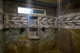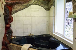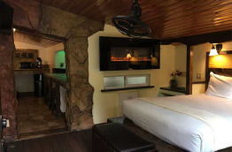 Le bungalow offre en plus une baignoire dans la salle de bains, et c’est également la chambre qui offre la décoration la plus originale avec une présence importante de pierre.