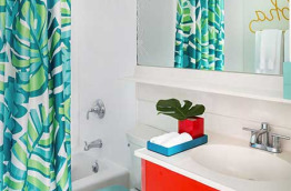 Le style de la décoration s’inspire du design des années soixante-dix. Le mobilier est en bois naturel vernis ou peint, les murs sont rouges, jaunes ou bleus, les lampes et les fauteuils colorés, même le rideau de douche et les rideaux sont bariolés de feuillage.