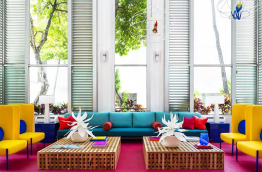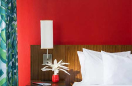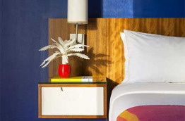 Si vous arrivez de nuit, vous serez accueillis par des néons de couleur fuchsia et violet. De jour, le hall de réception est au contraire clair et aéré, haut de plafond, avec du blanc, des touches de couleurs dans le mobilier et un mur rose. Les couloirs sont également colorés, mais plutôt sombres, et quand vous pénétrez dans votre chambre, la couleur éclate de partout.