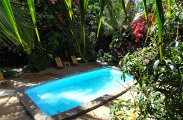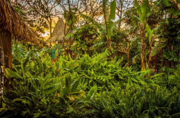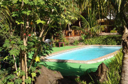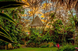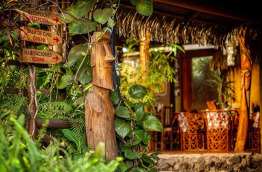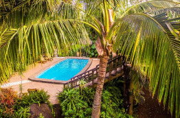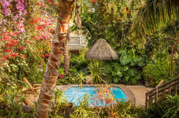L’hôtel Manavai possède une piscine entourée de roches et de sculptures dans le magnifique jardin tropical.