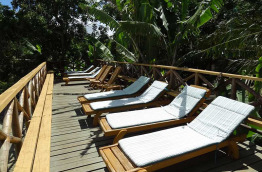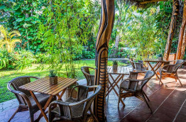 Les petits-déjeuners sont servis sur la terrasse extérieure, construite et décorée également en bois. Il s’agit d’un petit-déjeuner continental simple mais consistant.