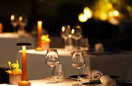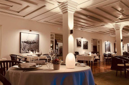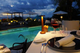 Au coucher de soleil, le restaurant gastronomique, installé sous la varangue, s’illumine à la lueur des chandelles, et offre une vue magnifique sur la piscine avec la mer en arrière-plan. L’ambiance est romantique, vous dégusterez des plats typiques doucement relevés d’épices locales, sur fond de jazz.