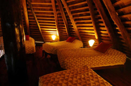 Le Bungalow Suite Famille, de 65 m2 au total, est composé de deux chambres, une au rez-de-chaussée avec un lit double et une en mezzanine, avec quatre lits simples, plus un canapé-lit dans le salon, avec une salle de bains avec douche.