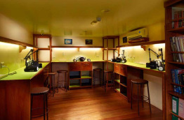 Le salon intérieur est aménagé luxueusement, il offre beaucoup d’espace et est très lumineux grâce à de belles ouvertures. Il est équipé de l’air conditionné, pourvu d’un bar et d’une bibliothèque. Une salle informatique et photo est disponible pour les photographes.