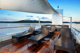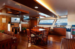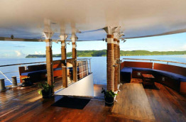 Sur le pont supérieur, on trouve un confortable salon et salle à manger en extérieur ainsi qu’un sundeck aménagé avec des chaises longues afin de profiter de quelques rayons de soleil entre deux plongées.
