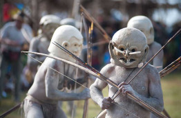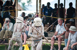 Vous pourrez admirer les performances d’une tribu voisine, celle des fameux « Mud Men » qui viennent du village de Asaro tout proche. La légende veut que la tribu, battue par une tribu ennemie, se réfugiât dans la rivière Asaro et attendit la nuit pour sortir du lit de la rivière, couverte de boue. La tribu adverse, effrayée par cette vision, crut qu’il s’agissait d’esprits et s’enfuit. La seule partie du corps des Mud Men qui n’est pas couverte de boue est le visage, car la boue de la rivière est réputée empoisonnée. La tribu des Mud Men porte des masques particulièrement reconnaissables, faits de pierres chauffées et d’eau de source.