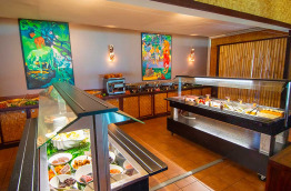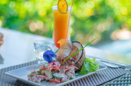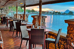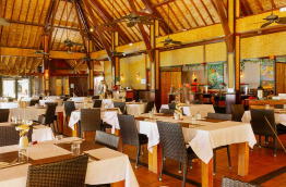 Situé au-dessus de l’eau et offrant une vue sur le lagon, le restaurant principal de l’hôtel, Ari’i, combine une cuisine avec des influences françaises, polynésiennes et internationales, avec des plats à base de poisson frais, de fruits et de légumes locaux.