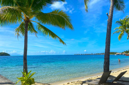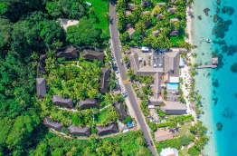 L’hôtel est séparé en deux parties : dans les jardins, à l’écart du bruit, il y a 10 bâtiments avec 8 chambres chacun. Face à la mer, on retrouve la réception, le restaurant et la piscine. Le Royal Bora Bora bénéficie d’une belle plage de sable blanc et d’un ponton pour accueillir les bateaux.