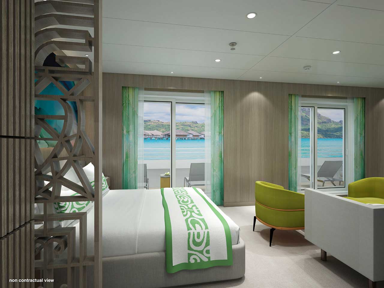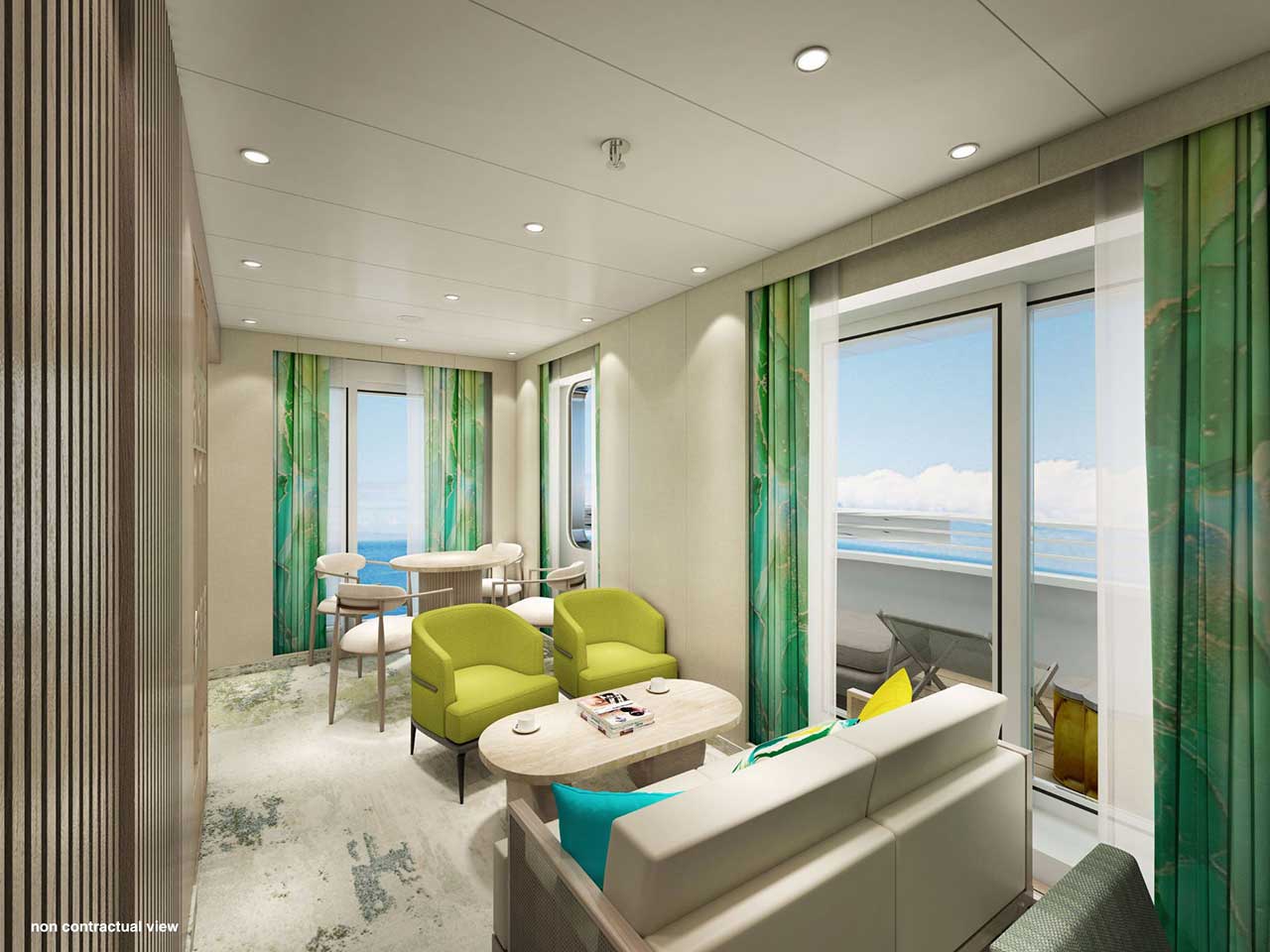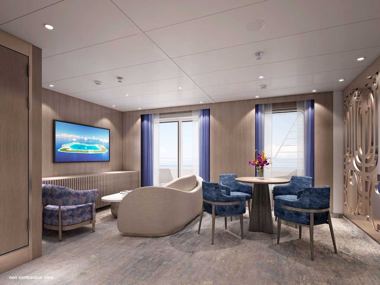1 Suite Présidentielle et 1 Suite Armateur de 42 m2, avec chacune un balcon de 7 m2, sont sur le pont 6. Elles disposent d’un salon séparé de la chambre.