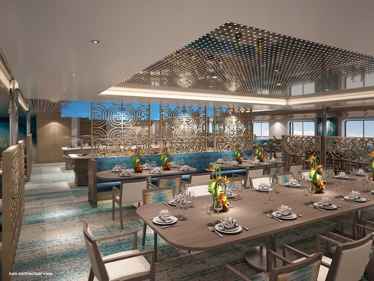 | Aménagements cabines | 91 cabines dont 2 dortoirs, 24 cabines Standard, 2 cabines Famille et 64 Suites, dont une Suite Présidentielle et une Suite Armateur. Serviettes de toilette, air conditionné, télévision, coffre-fort, réfrigérateur et machine à café dans les cabines, ainsi que douche et toilettes privatives. Les cabines sont réparties sur 7 ponts, et ont toute une vue extérieure (via un hublot ou un balcon) |