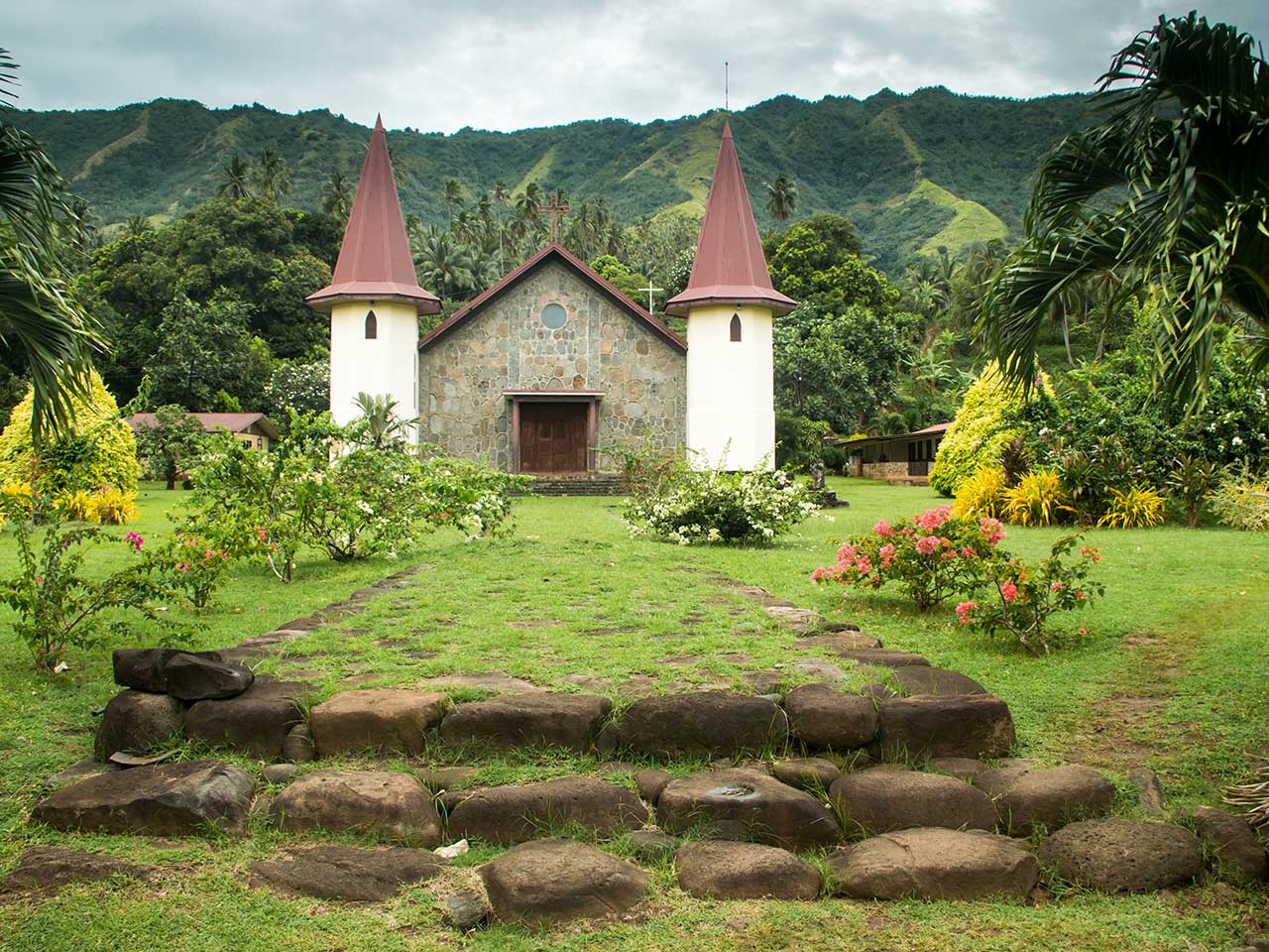 L’Aranui ancre dans la baie de Tahuata. Les annexes vous conduiront à terre sur la jetée de Vaitahu. Vous pourrez visiter la petite église Notre-Dame de l’Enfant Jésus, la tombe du Capitaine Halley, officier français tombé au combat lors de la bataille de Vaitahu, en septembre 1842. Il existe aussi un petit musée exposant quelques pièces archéologiques. Vous pourrez voir une plantation de vanille, et aurez du temps pour flâner au petit marché local et acheter des bananes séchées, du monoï, du bois de santal, et de la vanille.