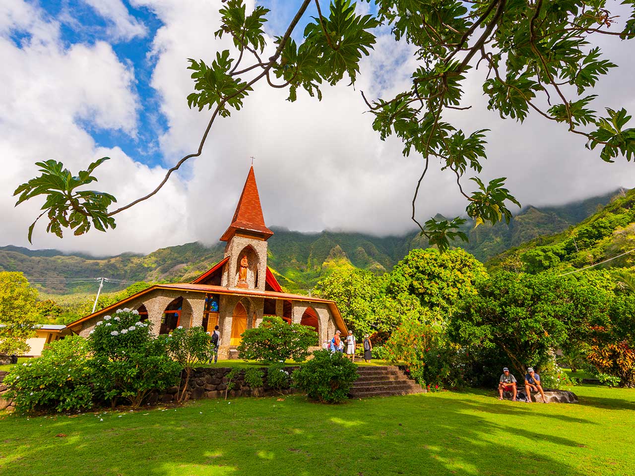 Votre aventure commencera par la visite de la cathédrale de Taiohae, célèbre pour ses sculptures. Au village de Hatiheu, vous visiterez le site archéologique de Tohua Kamuihei où se déroulaient les festivités publiques. Assis sous un banian géant, vous apprécierez un spectacle de chants et danses traditionnels, notamment la « Danse du cochon » originaire de Nuku Hiva. Le traditionnel « Umu » vous sera servi au déjeuner. C’est une spécialité marquisienne dont les ingrédients sont cuits dans un four encastré dans la terre.