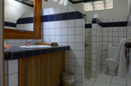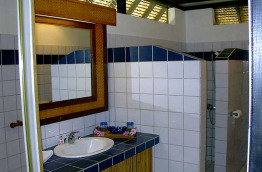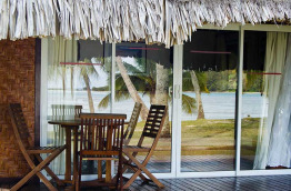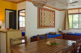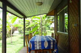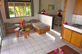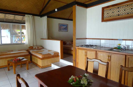 7 Bungalows Jardin avec cuisine et 2 Bungalows Plage avec cuisine sont assez spacieux (36 m2) et répartis dans les jardins, au calme, ou juste en front de lagon. Conçus pour loger quatre personnes, ils comptent une chambre avec un lit double, et deux lits jumeaux dans le salon. La chambre et le salon sont séparés par un rideau. Outre la salle de bains avec douche, vous trouverez ici une cuisine équipée avec réfrigérateur, plaques de cuisson, vaisselle, four à micro-ondes, cafetière électrique, bouilloire et grille-pain.