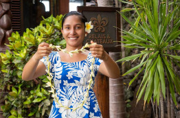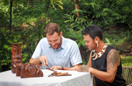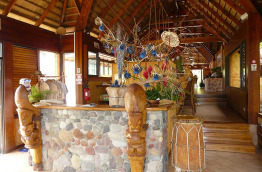 La décoration des bungalows a été réalisée par des artistes marquisiens, du parquet en acajou au mobilier en rotin, jusqu'aux sculptures marquisiennes du bungalow, ou aux décorations en tapa.
