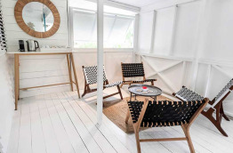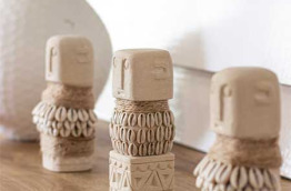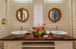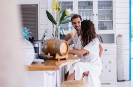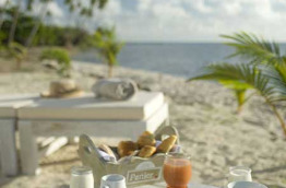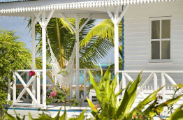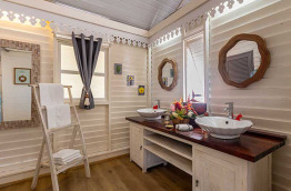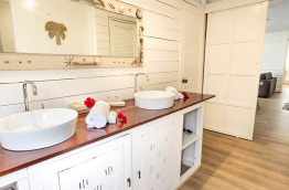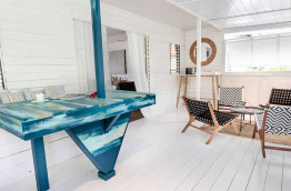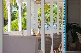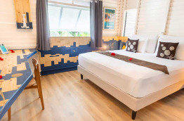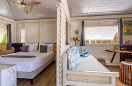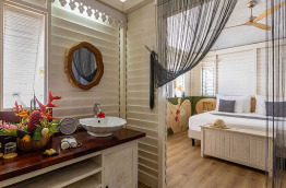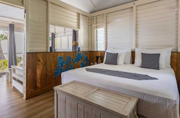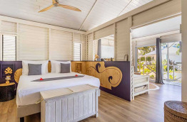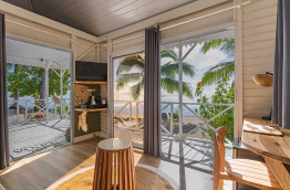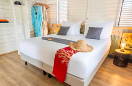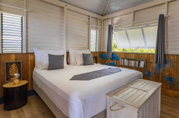 Chaque bungalow est décoré dans un style tropical, clair et épuré, avec du mobilier en bois, notamment du teck cérusé blanc. Des matériaux locaux contribuent au charme, comme des fibres de cocotier et des racines de miki-miki pour les luminaires.