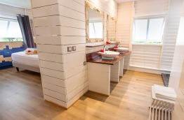1 Villa Famille – Vue Montagne est beaucoup plus spacieuse, avec environ 100 m2. Cette villa compte deux chambres, deux salles de bains, et un salon avec deux canapés. Son agréable terrasse est tournée côté montagne. Cet hébergement peut accueillir jusqu’à 2 adultes et 2 enfants.
