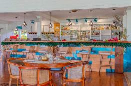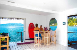 Le soir, le bar du lodge vous permet d’admirer le coucher du soleil sur l’île de Bora Bora. C’est un salon reposant avec tiki sculpté, mobilier colonial en teck, dans une ambiance musicale agréable.