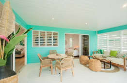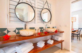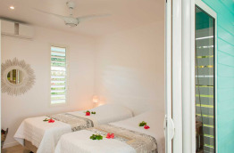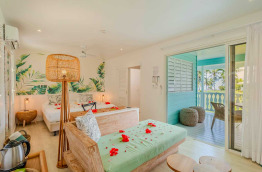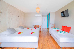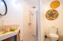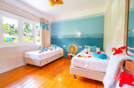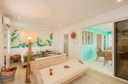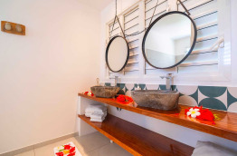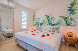 Les 3 Bungalows Famille Vue Lagon sont plus spacieux : ils mesurent 65 m2. Ces hébergements sont une option idéale pour les familles, puisqu’ils sont composés de deux chambres (une suite parentale avec un lit king-size et une chambre enfants avec deux lits simples). La salle de bains spacieuse communique entre les deux chambres.