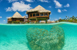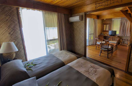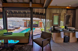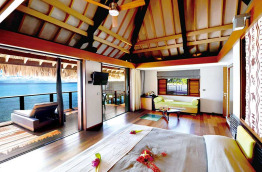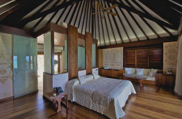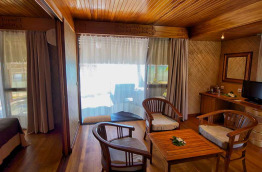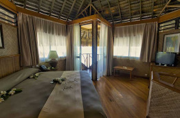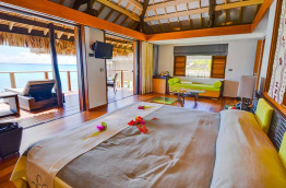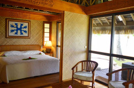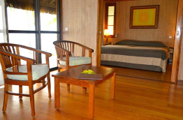 10 Bungalows sur pilotis, flottant au-dessus du lagon de Rangiroa. De votre terrasse privée, vous pourrez accéder directement aux eaux du lagon. Le décor est tout à fait polynésien, avec une dominante de bois dans un style assez moderne. La chambre comprend un petit salon, et une table basse en verre, au-dessus du lagon, vous permet d’observer les poissons. Un grand lit king-size fait face au lagon. La salle de bains comprend une douche et une baignoire.