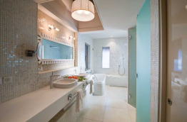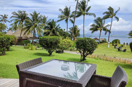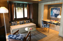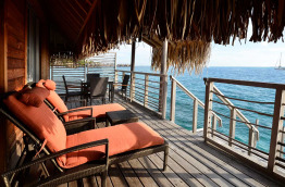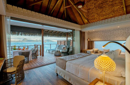 Les 13 Overwater Bungalows Ocean View sont également construits sur pilotis, mais le long d’un grand ponton de l’autre côté de l’hôtel, là où le lagon est le plus profond. Ils se trouvent tout près du restaurant Le Lotus et de sa piscine à débordement. Mesurant environ 37 m2, ils sont composés d’un espace chambre et d’un coin salon séparé, et donnent sur une terrasse d’environ 13 m2.