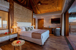 8 Motu Suite Overwater Bungalows sont construits sur pilotis autour du motu privé de l’hôtel, face au Lagoonarium et à la piscine principale. Ils mesurent environ 37 m2, et donnent sur une terrasse privative de 32 m2 pour accéder au lagon.