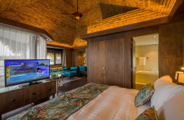 La One Bedroom Suite Moorea View est la plus vaste de l’hôtel, elle s’étend sur environ 115 m2. On y retrouve une chambre, une salle de bains, et un grand espace de vie comprenant le salon, la salle à manger et un bar privatif. Cette suite se trouve dans le même bâtiment que les Premium Rooms. Elle offre un grand balcon avec vue sur le lagon et l’île de Moorea au loin.