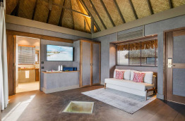 6 Overwater Bungalows situés au début du premier ponton, ont une table à fond de verre dans le salon. Notez qu’ils n’ont pas d’accès au lagon en raison de la faible profondeur, mais profitent tout de même de la superbe vue.