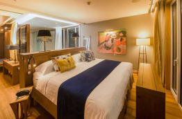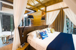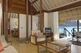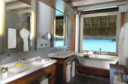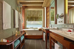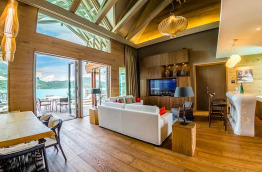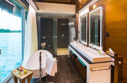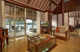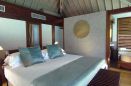 Elles sont toutes aménagées avec une chambre comprenant un lit double king-size, convertible en lit jumeaux, un salon où la table basse vitrée permet d’admirer les eaux du lagon. La salle de bains luxueuse comprend deux vasques, une douche spacieuse, une baignoire surélevée et une belle vue sur le lagon.