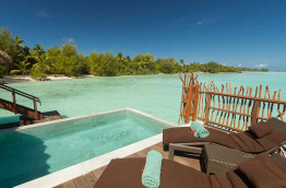 5 Overwater Pool Villa Lagoon View proches des parties communes de l’hôtel et ont des vues vers la plage et le motu. Les villas ont été rénovées à l’été 2017 dans un style contemporain chaleureux avec toujours une touche polynésienne. La terrasse est spacieuse, équipée de chaises longues et d’une piscine privée.