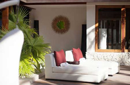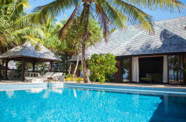 5 Beach Front Suite Villa, With Pool de 168 m2, dont 100 m2 intérieurs. Elles sont situées sur la plage, sous les palmiers, face au lagon, et bénéficient de la même configuration intérieure que les villas sur pilotis Overwater Villa. Le jardin clos comprend une douche extérieure, ainsi qu’une terrasse avec un gazébo et une petite piscine de 4 m x 3 m.