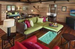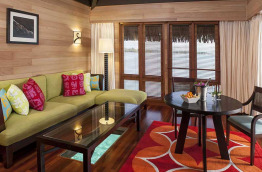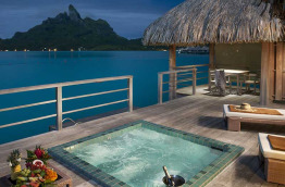 8 Overwater Premier Suite Villa, Mt. Otemanu View, Whirlpool font face au mont Otemanu. Elles sont plus grandes que les précédentes, 177 m2 dont 117 m2 en intérieur. Le salon intérieur est plus spacieux, alors que sur la terrasse, un bain à jets vous tendra les bras.