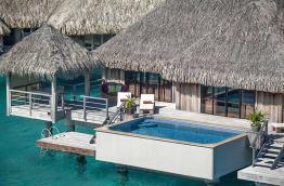 5 Overwater Royal Suite Villa, Mt. Otemanu View, Swimming Pool qui offrent une vue superbe sur l’île principale de Bora Bora, une piscine privée de 6 m x 4 m face au lagon, le tout sur une superficie totale de 320 m2, dont 157 m2 en intérieur. Pour les familles ou couples d’amis, une deuxième chambre adjacente peut être réservée en plus.
