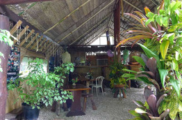 Les repas, faits maison ,sont servis au Fare Potee, bungalow central traditionnel polynésien, au milieu du jardin tropical, avec vue sur le lagon.