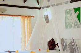 3 Deluxe Bungalow pouvant accueillir jusqu’à 3 personnes adultes dans 1 lit double, plus 1 lit simple, avec éventuellement un jeune enfant supplémentaire dans un lit d’appoint. Ces bungalows sont les plus proches de la mer.