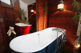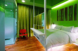 Les 4 Aqua Rooms sont plus spacieuses avec 32 mètres carrés de surface et donnent sur la rue Bukit Pasoh Road. Leur salle de bains avec baignoire est intégrée dans un espace vitré dans la chambre.