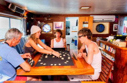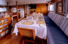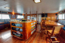 Les parties communes sont tout aussi luxueuses. Le salon principal, qui fait office de salle de restaurant, fait plus de 60 m2 de surface. Il est magnifique, très clair et aéré grâce aux fenêtres de chaque côté, et le sol est en bois massif verni. Un coin vidéo est aménagé pour que vous puissiez admirer vos prises de vue sous-marines entre les plongées, si vous le souhaitez. Vous y trouverez également une bibliothèque bien fournie, ainsi que des jeux de société.
